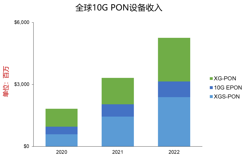 网络升级主要包括PON技术方面的投资,可通过单个OLT端口提供10Gbps带宽,带宽由数十名用户共享。短期目标是能够为每个家庭用户提供一致的对称1-5Gbps带宽。对网速的关注推动了10Gbps技术的投资大幅增长,包括10G EPON、XG-PON和XGS-PON。从2020年到2022年,支持10Gbps技术的OLT平台和ONT的支出增长了308%(图1)。