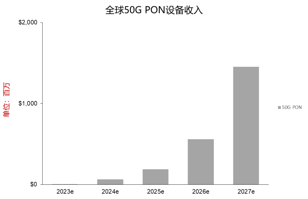 尽管处于早期,但Dell'Oro Group认为,从2023年到2027年,50G PON设备总收入将从不到300万美元增长至15亿美元。随着运营商们开始推动其10G PON网络向下一代技术演进,从2027年起这一收入增长将更加明显(如图2)。